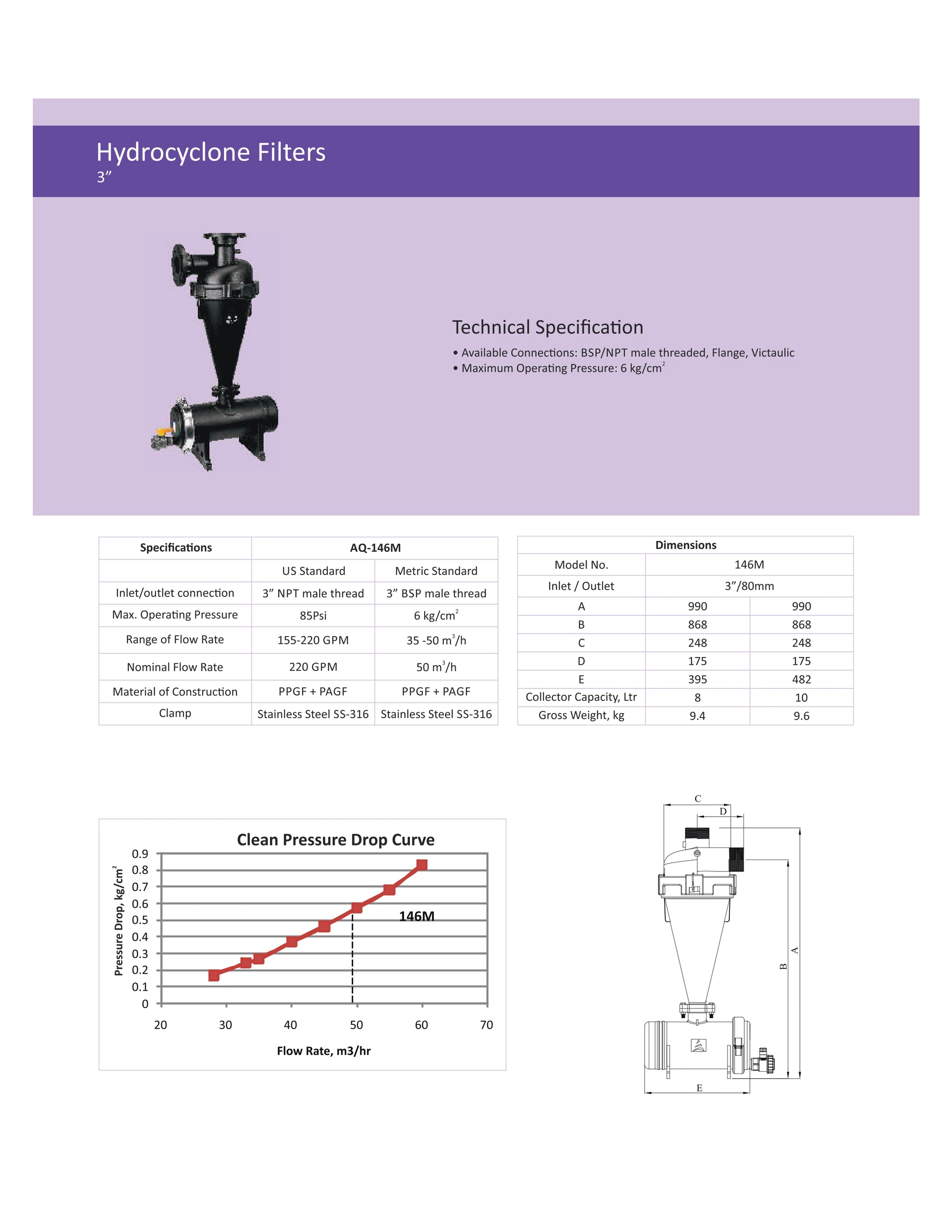 | Model No. | Inlet / Outlet Inch/mm | Rec. Range of Flow Rate, m3/hr | Nominal Flow Rate m3/hr | Dimensions (mm) | Capacity of Underflow Chamber (ltr) | Gross Weight | |||||